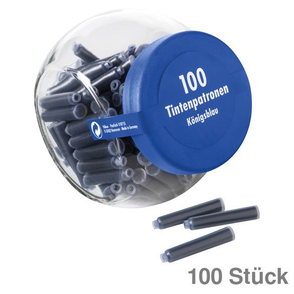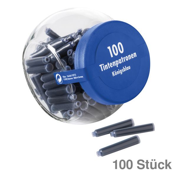 Tintenpatrone für Füllhalter Tintenpatronen Standard. Verwendung für Produkt: Patronenfüllhalter. Typbezeichnung der Tintenpatrone: Tintenpatrone. Löschbar. Auswaschbar. Farbe: königsblau. Glas mit 100 Patronen.