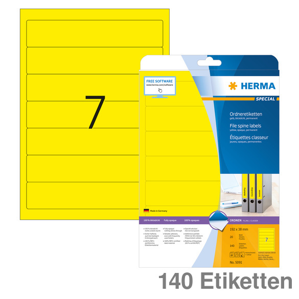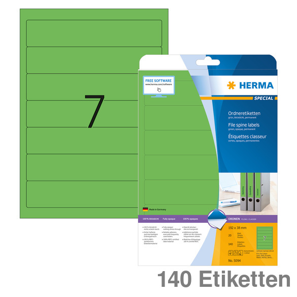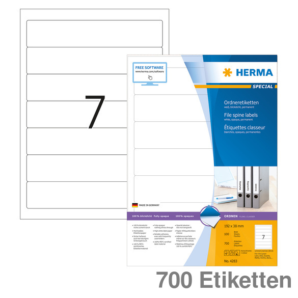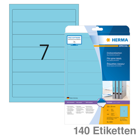 Ordneretiketten auf A4-Blättern, selbstklebend. Für ein einheitliches Erscheinungsbild im Büro und Zuhause. Für alle gängigen Ordner geeignet. Absolut blickdichtes Material mit hohem Weißgrad, alte Ordnerbeschriftungen scheinen nicht durch. Blanko: Ideal für Firmenlogo, Beschriftungen und Ordnungsvermerke. Sicher haftend, auch bei häufigem Ordnergebrauch. Umweltfreundlich: hochwertiges, chlorfrei gebleichtes Spezialpapier, PEFC-zertifiziert, lösemittelfreier Haftkleber. Etiketten sind 100 % recyclingfähig mit dem Altpapier, Verpackung aus Recyclingkarton. Sehr gute Druckergebnisse auf allen Laser- und Inkjetdruckern, Kopierern, Farblaserdruckern und Farbkopierern. Störungsfreie Verarbeitung durch Rundum-Sicherheitskante und optimale Planlage. Format: 38 x 192 mm. Farbe: blau