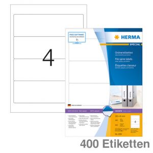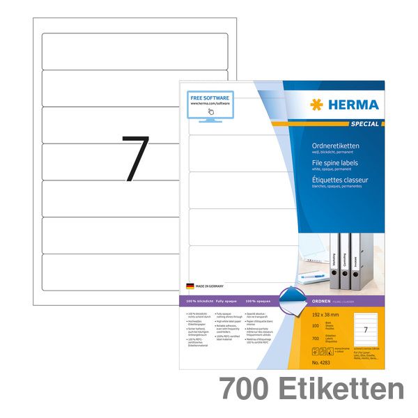 Ordneretiketten auf A4-Blättern, selbstklebend. Für ein einheitliches Erscheinungsbild im Büro und Zuhause. Für alle gängigen Ordner geeignet. Absolut blickdichtes Material mit hohem Weißgrad, alte Ordnerbeschriftungen scheinen nicht durch. Blanko: Ideal für Firmenlogo, Beschriftungen und Ordnungsvermerke. Sicher haftend, auch bei häufigem Ordnergebrauch. Umweltfreundlich: hochwertiges, chlorfrei gebleichtes Spezialpapier, PEFC-zertifiziert, lösemittelfreier Haftkleber. Etiketten sind 100 % recyclingfähig mit dem Altpapier, Verpackung aus Recyclingkarton. Sehr gute Druckergebnisse auf allen Laser- und Inkjetdruckern, Kopierern, Farblaserdruckern und Farbkopierern. Störungsfreie Verarbeitung durch Rundum-Sicherheitskante und optimale Planlage. Format: 38 x 192 mm. Farbe: weiß