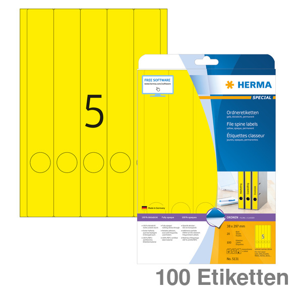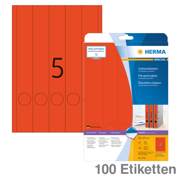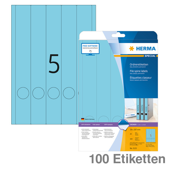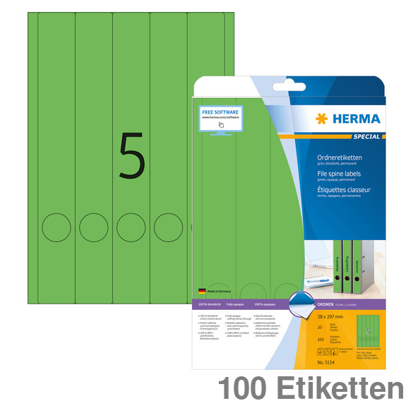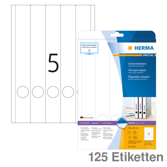 Ordneretiketten auf A4-Blättern, selbstklebend. Für ein einheitliches Erscheinungsbild im Büro und Zuhause. Für alle gängigen Ordner geeignet. Absolut blickdichtes Material mit hohem Weißgrad, alte Ordnerbeschriftungen scheinen nicht durch. Blanko: Ideal für Firmenlogo, Beschriftungen und Ordnungsvermerke. Sicher haftend, auch bei häufigem Ordnergebrauch. Umweltfreundlich: hochwertiges, chlorfrei gebleichtes Spezialpapier, PEFC-zertifiziert, lösemittelfreier Haftkleber. Etiketten sind 100 % recyclingfähig mit dem Altpapier, Verpackung aus Recyclingkarton. Sehr gute Druckergebnisse auf allen Laser- und Inkjetdruckern, Kopierern, Farblaserdruckern und Farbkopierern. Störungsfreie Verarbeitung durch Rundum-Sicherheitskante und optimale Planlage. Format: 38 x 297 mm Farbe: weiß