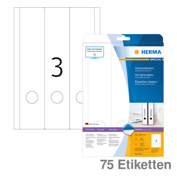 Ordneretiketten auf A4-Blättern, selbstklebend. Für ein einheitliches Erscheinungsbild im Büro und Zuhause. Für alle gängigen Ordner geeignet. Absolut blickdichtes Material mit hohem Weißgrad, alte Ordnerbeschriftungen scheinen nicht durch. Blanko: Ideal für Firmenlogo, Beschriftungen und Ordnungsvermerke. Sicher haftend, auch bei häufigem Ordnergebrauch. Umweltfreundlich: hochwertiges, chlorfrei gebleichtes Spezialpapier, PEFC-zertifiziert, lösemittelfreier Haftkleber. Etiketten sind 100 % recyclingfähig mit dem Altpapier, Verpackung aus Recyclingkarton. Sehr gute Druckergebnisse auf allen Laser- und Inkjetdruckern, Kopierern, Farblaserdruckern und Farbkopierern. Störungsfreie Verarbeitung durch Rundum-Sicherheitskante und optimale Planlage. Format: 61 x 297 mm Farbe: weiß
