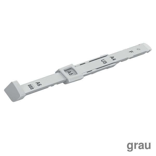 Stabile Anschlagschiene mit klar erkennbaren Formatangaben. Einfache Handhabung. Alle gebräuchlichen Formate sind aufgedruckt: A4, A5, A6, Folio, US-Quart, 4-fach Lochung (8 x 8 x 8).
