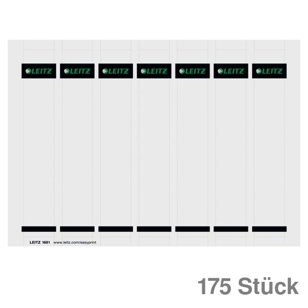 Rückenschild, zum Einstecken, kurz, schmal, PC-beschriftbar, auf A4-Papier, mit Perforation zum Heraustrennen, für Plastic-Ordner, für Laser- und Inkjetdrucker, lösungsmittelfrei. Material: Karton 130 g/qm. Format: 32 x 190 mm. Inhalt: 175 Stück. Farbe: grau.
