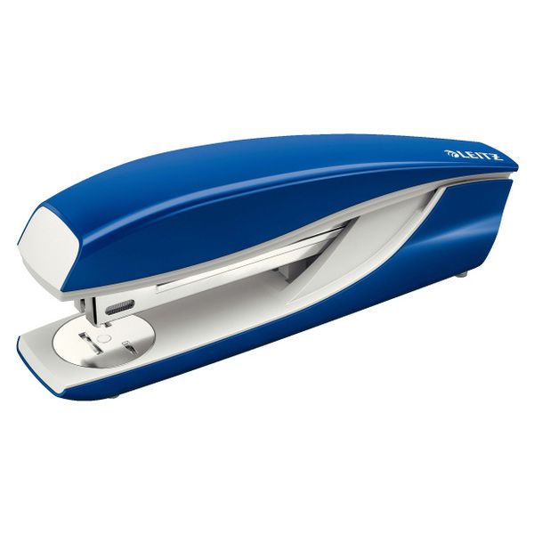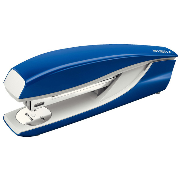 Büroheftgerät Groß NeXXt, mit Oberlademechanik, für offene und geschlossene Heftung, Tackerfunktion, mit Drehamboss und integriertem Entklammerer, mit Direct Impact Technology (DIT) für perfektes und problemloses Heften, befüllt mit Heftklammern 24/6. Heftleistung: 4 mm/40 Blatt. Heftklammern: 150 x 24/6, 150 x 24/8 oder 210 x 26/6. Einlegetiefe: 60 mm. Material: Metall mit Kunststoff. 10 Jahre Garantie nur bei Verwendung von Leitz Heftklammern, GS-geprüft. Farbe: blau