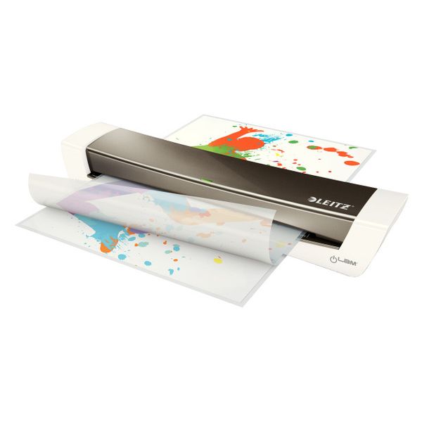 Laminiergerät iLAM Home Office. Einfaches Laminieren mit perfekten Ergebnissen, keine komplizierten Einstellungen erforderlich. Mit LED-Bereitschaftsanzeige und akustischem Warnton. Mit Freigabeschalter um verklemmte Dokumente zu entnehmen. Mit indirekter Heizung über den Rollen. Niedriger Energieverbrauch, automatische Abschaltung nach 30 Minuten. Empfohlen für die Verwendung mit Leitz UDT Folien.