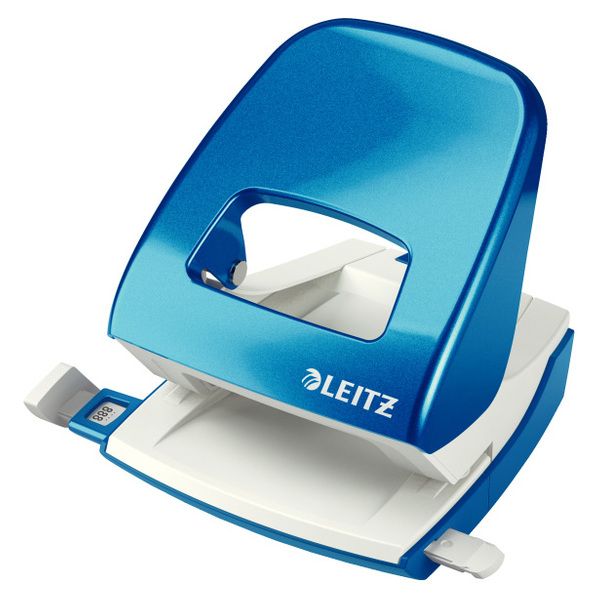 Bürolocher NeXXt Metall, mit Anschlagschiene aus Kunststoff, Anschlagschiene mit farbiger Bedruckung und Fenster. Mit transprarentem, rutschfestem Kunststoffboden (Abfallkasten), mit patentierter Griffmulde und ultra-scharfen Lochstempeln, auch für 4-fach Lochung geeignet. Stanzleistung/Blatt: 3 mm/30. Material: Metall. 10 Jahre Garantie, GS-geprüft. Blisterverpackung. Farbe: metallic-blau