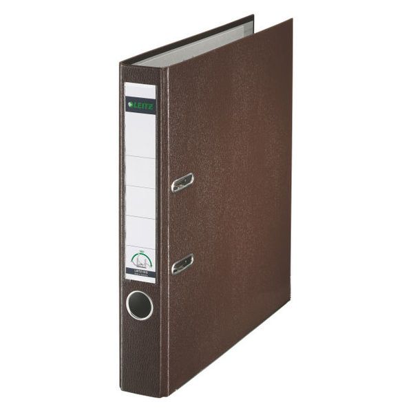 Qualitäts-Ordner Plastik schmal, mit patentierter 180°-Präzisionsmechanik für 50% weiteres Öffnen und 20% schnelleres Arbeiten. Mit Schlitzen, Griffloch, Kantenschutz, Deckblatt, Sichttasche am Rücken und auswechselbarem Rückenschild. Material: Einband aus Pappe (RC), mit Polypropylen-Folie kaschiert, innen Polyethylen-beschichtetes, graues Papier. Format: für A4, 318 x 285 mm, Rückenbreite: 52 mm. 5 Jahre Garantie auf die Mechanik. GS-geprüft. FSC-zertifiziert. Farbe: braun.