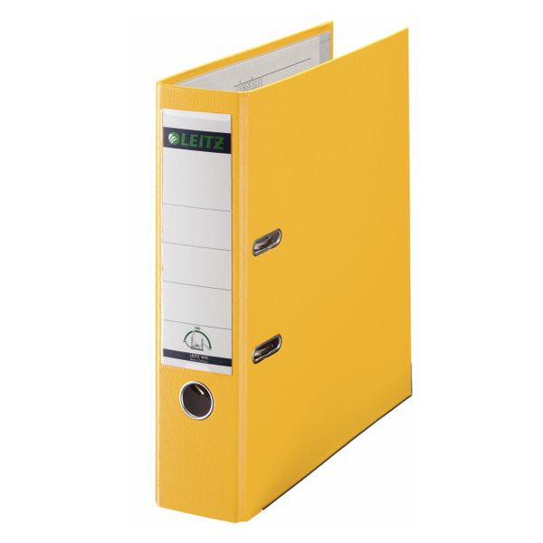 Qualitäts-Ordner Plastik breit, mit patentierter 180°-Präzisionsmechanik für 50% weiteres Öffnen und 20% schnelleres Arbeiten. Mit Schlitzen, Griffloch, Kantenschutz, Deckblatt, Sichttasche am Rücken und auswechselbarem Rückenschild. Material: Einband aus Pappe (RC), mit Polypropylen-Folie kaschiert, innen Polyethylen-beschichtetes, graues Papier. Format: für A4, 318 x 285 mm, Rückenbreite: 80 mm. 5 Jahre Garantie auf die Mechanik. GS-geprüft. FSC®-zertifiziert. Farbe: gelb.