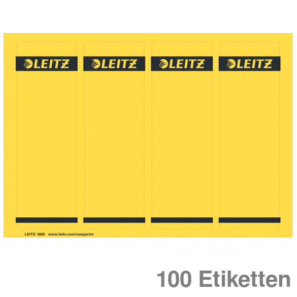 Rückenschild, selbstklebend, kurz, schmal, PC-beschriftbar, auf A4-Papier, für Standard- und Hartpappe-Ordner, hohe Deck- und Klebekraft, mit Greifrand, für Laser-, Tintenstrahldrucker und Kopiergeräte, lösungsmittelfrei. Material: Papier. Format: 39 x 191 mm. Inhalt: 150 Stück. Farbe: gelb.