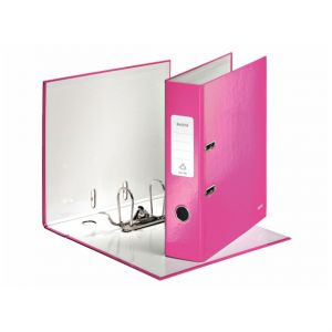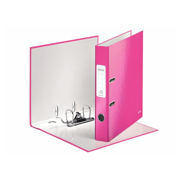 Qualitäts-Ordner WOW schmal, mit patentierter 180º-Präzisionsmechanik. 5 Jahre Garantie auf die Mechanik, GS-geprüft. 50% weitere Mechaniköffnung für schnelleres und komfortableres Arbeiten. Ablegen auch auf der linken Seite möglich. GS-geprüft. Mit Schlitzen, mit Griffloch, mit Deckblatt, mit aufgeklebtem, abziehbarem Rückenschild, die laminierte Oberfläche verleiht dem Ordner ein glänzendes, hochwertiges Design. Material: Einband aus Pappe (RC), außen und innen mit laminiertem Papier kaschiert. Format: für A4, 318 x 285 mm, Rückenbreite: 50 mm. FSC®-zertifiziert. Farbe: pink.