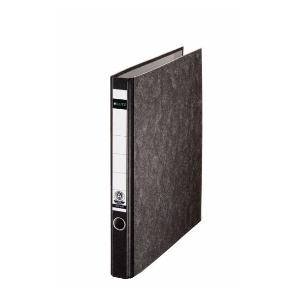 Ringordner, ohne Schlitze. Mechanik: 2-Ring-Reißmechanik und Blattniederhalter. Ringdurchmesser: 20 mm, Füllhöhe: 15 mm, Rückenbreite: 35 mm. Material: Einband aus Pappe (RC) mit Wolkenmarmorpapier (RC) kaschiert. Rücken mit Spezialpapier verstärkt. Format: 318 x 285 mm, für A4. FSC®-zertifiziert. Farbe: schwarz.