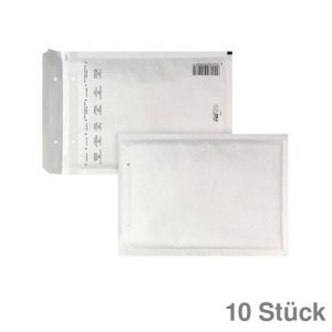 Innen: Luftpolsterfolie. Außen: Kraftpapier mit PE-Beschichtung. 50-mm-Klappe mit Haftklebung. Verschlussmöglichkeiten wahlweise Lochung oder Adhäsion für Versand als offene Sendung oder sicher verschlossen mit Haftklebung und Abdeckstreifen. Farbe: weiß, Maße: 230 x 340 mm