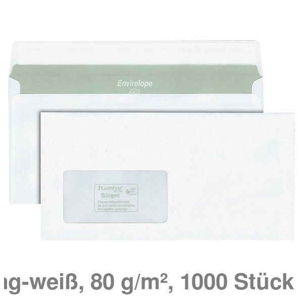 Briefumschlag Envirelope, DIN lang, haftklebend, mit Fenster, 1.000 Stück. CO2 neutrale Herstellung, Produktion mit Ökostrom. Druck mit Ökofarben. Biologisch abbaubare Fensterfolie. Für Kuvertiermaschinen geeignet. Farbe weiß. Klebeart: haftklebend.
