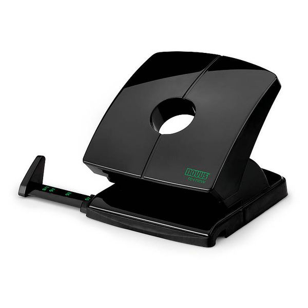 Nachhaltiger Bürolocher für den professionellen Einsatz. Sicher einrastende Anschlagschiene mit gut ablesbarer Formatanzeige: Folio, DIN A4, US, B5, DIN A5, B6, DIN A6, 3x8. Rutschfester Boden, der sich zum Entleeren halb öffnen und einfach wieder verschließen lässt. Vollmetallgerät mit kunststoffummanteltem Hochglanzoberteil aus nachhaltigem Rezyklat. Gewicht: ca. 350 g.