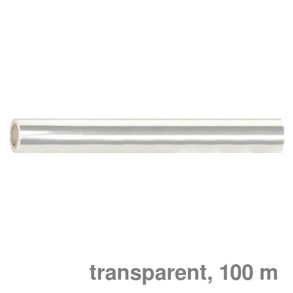Transparentfolie unbedruckt auf Rolle. Länge: 100 m, Breite: 70 cm, Materialstärke: 25 my, als Blumenfolie oder Geschenkfolie einsetzbar, auf 50-mm Secarekern, geeignet für Geschenkpapier-Abrollgeräte, Material: PP