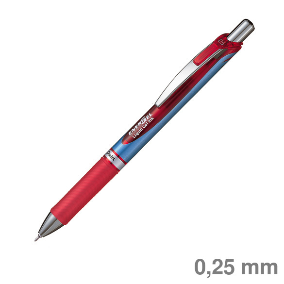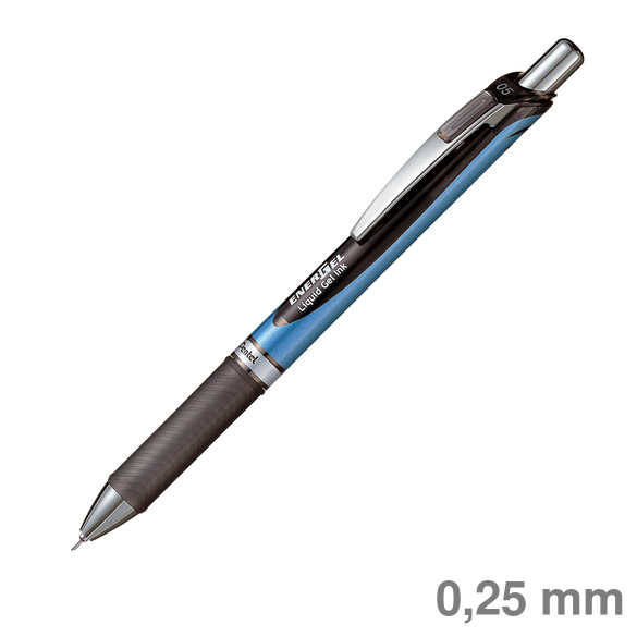 Liquid-Gel-Tintenroller EnerGel Xm Retractable. Ausführung der Vorschubmechanik: Druckmechanik. Typbezeichnung der Mine: LRN5. Art der Schreibflüssigkeit: schnell trocknende Liquid-Gel-Tinte. Ausführung Mine: Nadelspitze, 0,25 mm, blau, Mine auswechselbar. Ausführung Stift: Kunststoff, Gummierung in Schreibfarbe, Material des Clips: Metall. Griffzone und Clip mit Kennzeichnung in Schreibfarbe, ideal auch für Linkshänder durch schnell trocknende Tinte. Farbe des Schaftes: silber/blau.