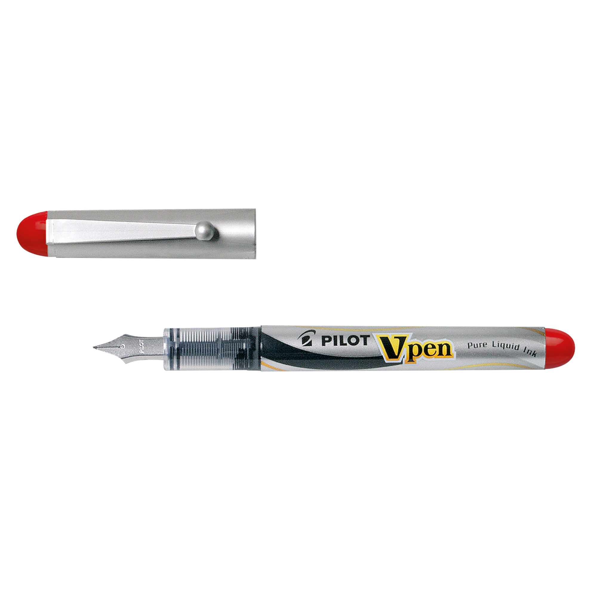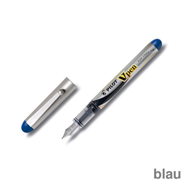 Einweg-Füllfederhalter V-Pen. Mit druckstabiler Edelstahlfeder. Schreibfarbe: blau. Schaft und Kappe aus Kunststoff. Transparente Griffzone und Tintensichtfenster. Einwegstift mit Liquid-Ink-Technik. Gehäuse-Endstück und Kappen-Endstück in Schreibfarbe. Federstärke: 0,4 mm. Schaftfarbe: silber in attraktivem Design.