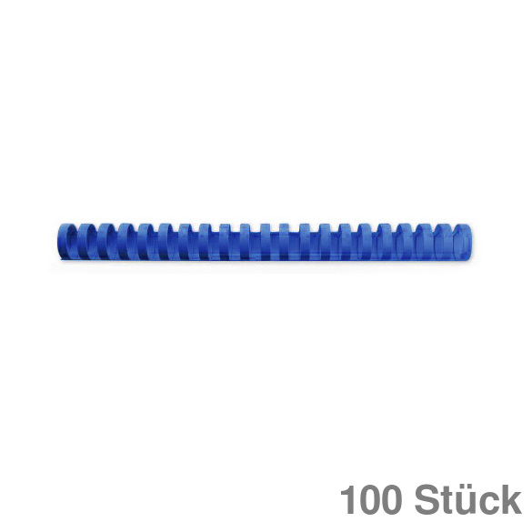 Plastikbinderücken mit US-Teilung, 21-Ringe, geeignet für A4. Formstabil und dauerelastisch. Mehrmals zu öffnen, ohne die Spannung zu verlieren. Für maximal 95 Blatt geeignet. Durchmesser: 12mm, Farbe: blau