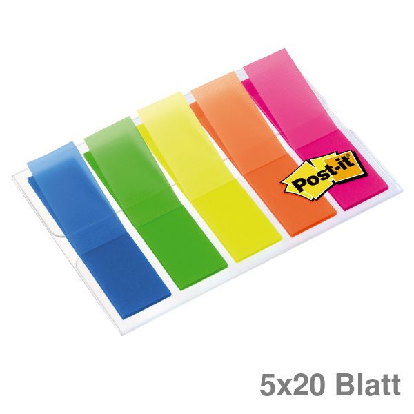 Haftstreifen Index Leuchtfarben. Selbsthaftend, wiederablösbar, signalstark und beschriftbar. Werkstoff: Polyester. Anzahl der Blätter: 20 Blatt. Größe (B x H): 11,9 x 43,2 mm. Farbe: blau, gelb, grün, orange, pink.