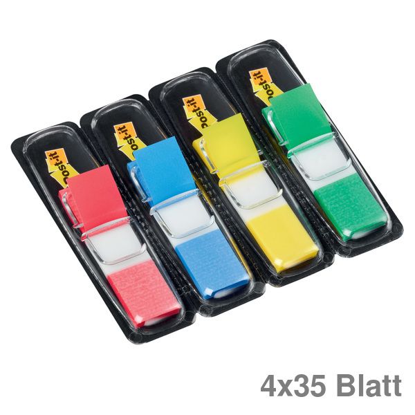 Haftstreifen Index Mini. Extraschmale Variante, selbsthaftend, wiederablösbar, signalstark und beschriftbar, einzelne Spender sind trennbar. Werkstoff: Polyester. Größe (B x H): 11,9 x 43,2 mm. Farbe: rot, blau, gelb, grün.