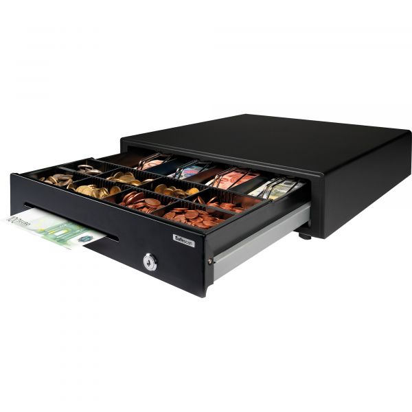 Die Kassenlade SD-4141 wird aus soliden Materialien gefertigt. Das robuste Gehäuse und das bruchsichere PVC-Fach mit stabilen Metall-Geldklemmen wurden für mittelstark frequentierte Einsatzorte, wie z.B. Schul- und Bürocafeterien sowie Klubhaus-Kantinen, entwickelt. Die SD-4141 verfügt über belastbare Kugellagerrollen und einen robusten Schließmechanismus, der garantiert mindestens 1 Million störungsfreie Öffnungs-/Schließvorgänge ermöglicht. Die anpassbaren Geldschein-Trennfächer erlauben Ihnen eine Aufteilung der SD-4141 für genau die für Sie relevanten Banknoten und die ebenfalls anpassbaren Münzbecher halten Wechselgeld und Wertmarken ordentlich sortiert. Ein großer Separierungsschlitz bietet viel Platz zur Aufbewahrung von Gutscheinen, Kreditkartenbelegen und anderen unbaren Belegen. Die SD-4141 verfügt über ein 3-Positionen, 4-Funktionen Schloss sowie über einen RJ12-Anschluss (zur Integration in Ihr POS-System wie Registrierkasse oder POS-Drucker) für ein Maximum an Benutzerfreundlichkeit ohne Kompromisse hinsichtlich der Sicherheit. Sie können die Kassenlade automatisch über Ihre Registrierkasse, über Ihren Drucker oder aber manuell öffnen. Schließen Sie sie mit der "closed" Position ab (wenn Sie den Kassenbereich kurz verlassen müssen) oder wählen Sie die "open" Position (bei leerer Kasse, zur Abschreckung von Dieben). Die Kassenlade SD-4141 kann zudem durch sanften Druck jederzeit manuell geöffnet werden. 3 Jahre Garantie bei Registrierung. Verwendung für Produkt: RJ12 Registrierkassen (12 V). Maße: 41 x 11,5 x 41,5 cm (B x H x T). 4 Fächer für Banknoten. 8 Fächer für Hartgeld. inkl. 2-teiliges Schlüsselset. Masse (Gewicht): 6,6 kg. Material des Gehäuses: Stahl. Farbe: schwarz.