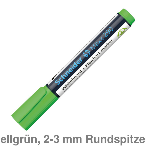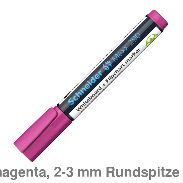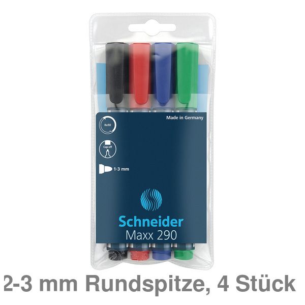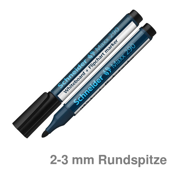 Whiteboard- und Flipchart-Marker mit Rundspitze für Strichstärke 2 - 3 mm. Etui mit 4 Stück: schwarz, rot, blau, grün. Die kräftige farbintensive Schrift ist auf Tafel und Papier auch in hinteren Reihen gut lesbar. Sie ist von weißen Wandtafeln rückstandsfrei trocken abwischbar und schlägt bei Flipcharts nicht auf nachfolgende Seiten durch. Die Cap-Off-Tinte trocknet nicht ein, auch wenn der Marker 2-3 Tage offen bleibt. Sie ist geruchsarm und frei von Toluol und Xylol. Das neue voluminöse Format bietet höchste Markierleistung und die neue Rundspitze schreibt angenehm weich ohne nervendes Quietschen. Der Maxx 290 hat eine praktische Clipkappe und ist nachfüllbar mit der Refill station Maxx 665.