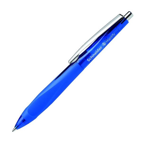 Kugelschreiber mit ergonomisch gummiertem Drei-Flächen-Griff für eine ideale Haltung der Hand. Die auswechselbare Metallmine Express 775 Medium (M) sorgt für ein angenehm weiches Schreibgefühl. Schreibfarbe analog zur Gehäusefarbe: blau, dokumentenecht nach ISO 12757-2. Haptify hat einen stabilen Metallclip und ist mit verschiedenen Minenformaten nachfüllbar.