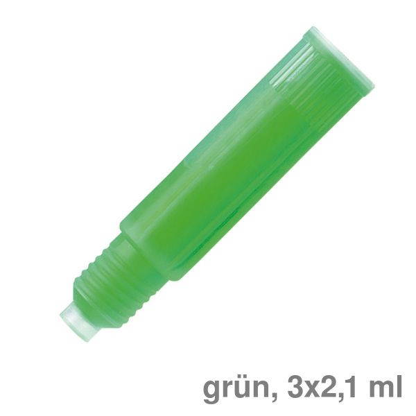 Drei grüne Patronen zum einfachen und sauberen Nachfüllen des Textmarkers Schneider Maxx Eco 115. Jede Patrone ersetzt einen neuen Textmarker.