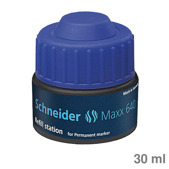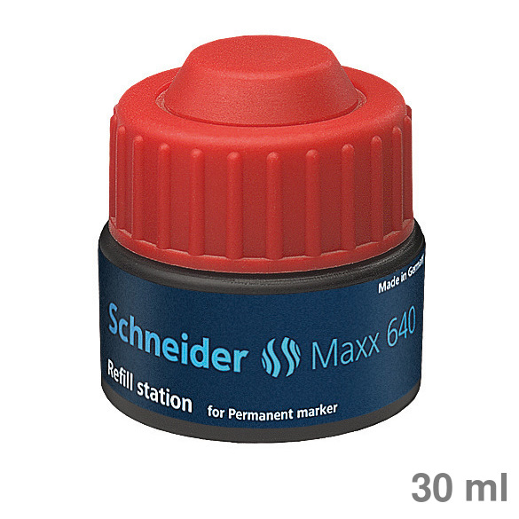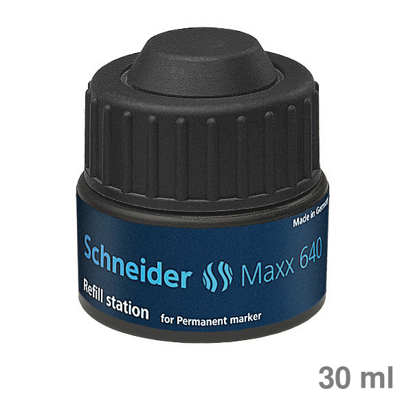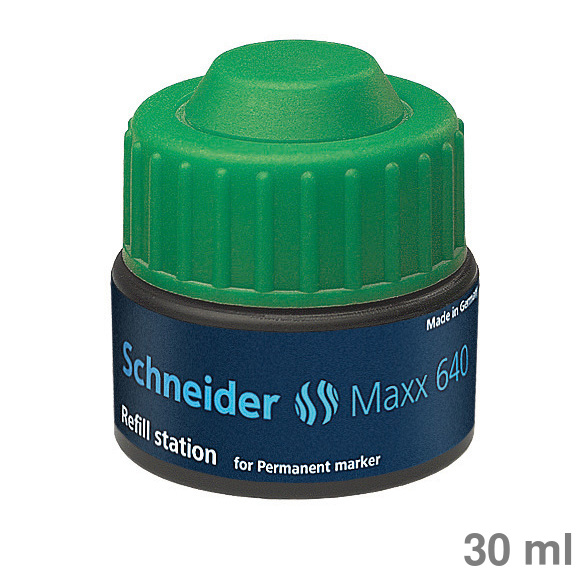 Refill Station zum Nachfüllen der Permanent-Marker Schneider Maxx 130 und 133. Inhalt 30 ml, Farbe: grün. Einfach Marker in die Station stellen und automatisch befüllen lassen. Eine Überfüllung ist ausgeschlossen.