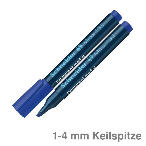 Permanentmarker mit Keilspitze, Strichstärke 1 + 4 mm. Schreibfarbe blau. Zum Beschriften von Karton, Papier, Kunststoff, Glas, Metall, Holz und fast allen anderen Materialien. Die Markierung ist schnelltrocknend, wasserfest und gut lichtbeständig. Die Cap-Off-Tinte trocknet nicht ein, auch wenn der Marker 2-3 Tage offen bleibt. Sie ist geruchsarm und frei von Toluol und Xylol. Der Marker hat eine praktische Clipkappe und ist nachfüllbar mit der Refill station Maxx 640.