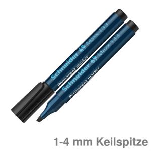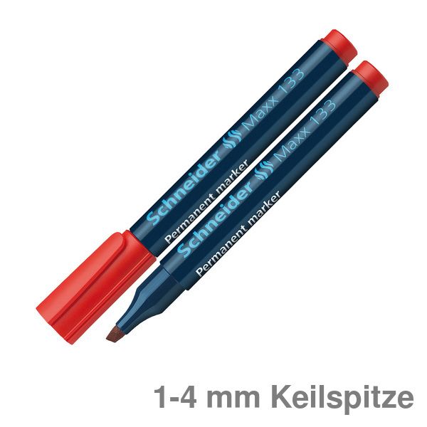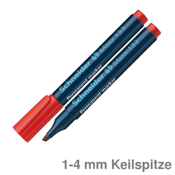 Permanentmarker mit Keilspitze, Strichstärke 1 + 4 mm. Schreibfarbe rot. Zum Beschriften von Karton, Papier, Kunststoff, Glas, Metall, Holz und fast allen anderen Materialien. Die Markierung ist schnelltrocknend, wasserfest und gut lichtbeständig. Die Cap-Off-Tinte trocknet nicht ein, auch wenn der Marker 2-3 Tage offen bleibt. Sie ist geruchsarm und frei von Toluol und Xylol. Der Marker hat eine praktische Clipkappe und ist nachfüllbar mit der Refill station Maxx 640.