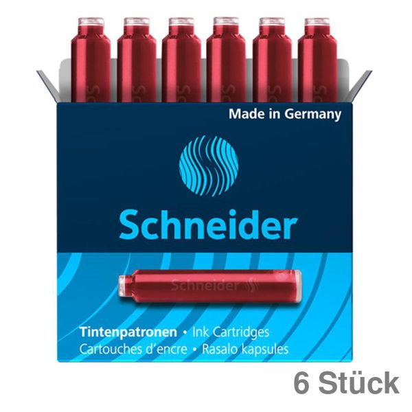Sechs Standard-Tintenpatronen mit Kugelverschluss, rot. Für Schneider und viele andere Füller und Patronenroller.