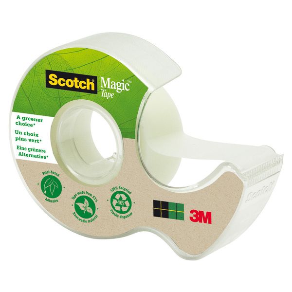 Handabroller A greener choice. Nachfüllbar. Abroller aus 100 % recyceltem Kunststoff, leichtes Abreißen durch gezackte Kunststoffklinge, ergonomische Form, hakenfähig, inklusive 1 Rolle Klebeband Magic 900 A greener choice 19 mm x 20 m. Bandgröße max. (L x B): 20 m x 19 mm. Gefüllt. Farbe: transparent.