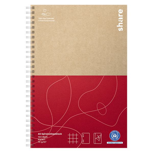 Der Block, der was verändert! Der Collegeblock von share ist stylisch und weniger anfällig für Eselsohren. Und obendrauf: Jeder Kauf spendet eine Unterrichtsstunde. Grammatur: 70 g/m². 100 % recycelt. 4fach Lochung. Spiralbindung.