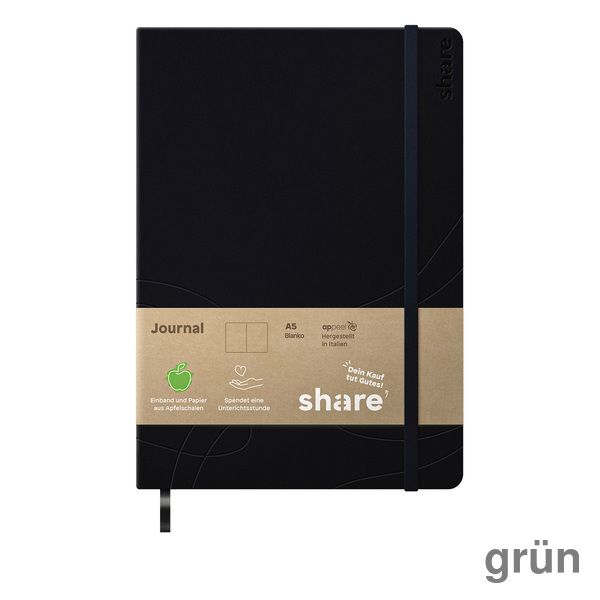 Dieses Notizbuch von share spendet eine Schulstunde. Aber nicht nur durch die soziale Spende ist es etwas ganz Besonderes: share hat es geschafft, ein Cover herzustellen, das sich so hochwertig und angenehm wie Leder anfühlt, dabei aber keinem Tier etwas zu Leide tut. Dafür werden Apfelschalen genutzt, die bei der Apfelsaftherstellung übrig bleiben. Auch das Papier wird aus Äpfeln und Pflanzenfasern hergestellt. DIN A5. punktkariert (dotted). Grammatur: 80 g/m². Fadenbindung. Softcover. Material des Einbandes: Pflanzenfasern/Apfelschalen. 96 Blatt.