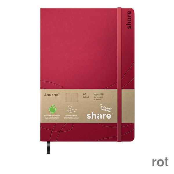 Dieses Notizbuch von share spendet eine Schulstunde. Aber nicht nur durch die soziale Spende ist es etwas ganz Besonderes: share hat es geschafft, ein Cover herzustellen, das sich so hochwertig und angenehm wie Leder anfühlt, dabei aber keinem Tier etwas zu Leide tut. Dafür werden Apfelschalen genutzt, die bei der Apfelsaftherstellung übrig bleiben. Auch das Papier wird aus Äpfeln und Pflanzenfasern hergestellt. DIN A5. punktkariert (dotted). Grammatur: 80 g/m². Fadenbindung. Softcover. Material des Einbandes: Pflanzenfasern/Apfelschalen. 96 Blatt.