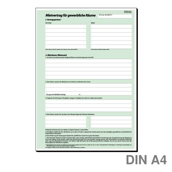 Mietvertrag für gewerbliche Räume, mit Vereinbarungen über den Mietzweck bzw. die beabsichtigte Nutzung des Mietobjektes. Der Vertrag entspricht der aktuellen Gesetzgebung