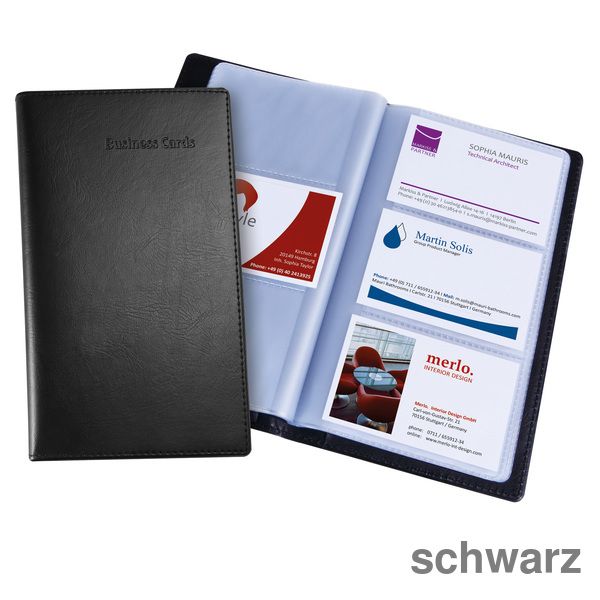 Visitenkarten-Mappe in matt-schwarzer Lederoptik zur übersichtlichen Aufbewahrung von Visitenkarten oder anderen Karten. Mit 20 transparenten Hüllen, die sowohl auf der Vorder- als auch der Rückseite befüllt werden können, zur Organisation von bis zu 120 Karten (max. 90 x 58 mm). Die Größe der Mappe beträgt 110 x 192 x 12 mm (B x H x T).