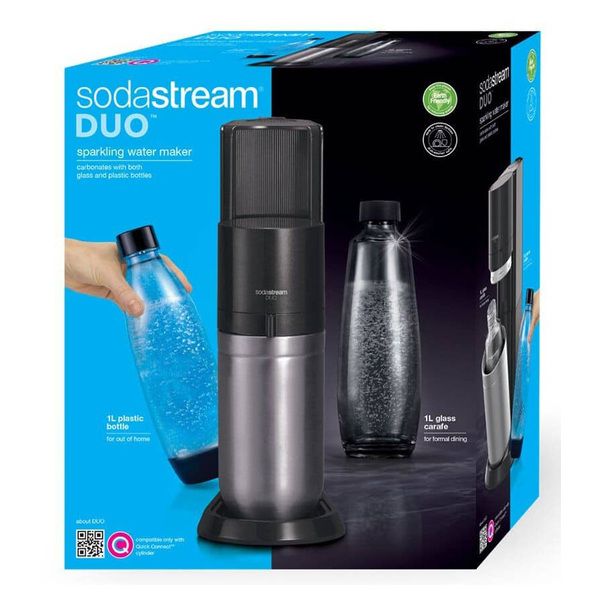 Trink dein Sprudelwasser zuhause aus der Glasflasche und unterwegs aus der Kunststoffflasche. Kompakter Wassersprudler, der unter jeden Küchenschrank passt. Funktioniert kabellos und ist einfach in der Handhabung. Maße: 15,8 x 44 x 31 cm (B x H x T). inkl. je 1 x 1 l Glasflasche (Fülllinie 0,84 l) , 1 l Kunststoffflasche (Fülllinie 0,84 l) spülmaschinengeeignet, Quick Connect CO2-Zylinder für ca. 60 l. 2,76 kg. Material des Gehäuses: Kunststoff. Farbe des Gehäuses: schwarz. Gefahrenhinweise: Enthält unter Druck stehendes Gas; kann bei Erwärmung explodieren. Im Zylinderventil befindet sich eine Berstscheibe, durch die der Inhalt des Zylinders sicher abgelassen wird, bevor der Testdruck erreicht wird, damit der Zylinder geschützt wird.. Sicherheitshinweise: An einem gut belüfteten Ort aufbewahren.