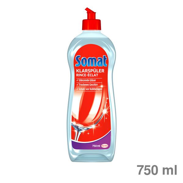 Somat Klarspüler mit 3x Glanz Aktiv gibt Ihrem Geschirr kristallklaren Glanz. Der Klarspüler entfernt Rückstände für einen klaren, fleckenlosen Glanz.