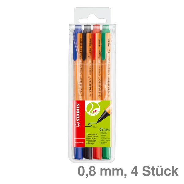Filzschreiber STABILO® GREENpoint® Etui. Typbezeichnung der Mine: Faserspeicher. Ausführung Spitze: Rundspitze, 0,8 mm, geeignet für Schablone. Art der Schreibflüssigkeit: Tinte auf Wasserbasis, rot, grün, blau, schwarz. Kann einige Tage offen liegen bleiben, ohne einzutrocknen. Hergestellt aus 87% recyceltem Kunststoff. Robuste breite Spitze - für sanftes Schreiben, ausdrucksstarkes Hervorheben und farbintensives Strukturieren. Ausführung der Griffzone: recycelter PP. Farbe der Kappe: in Schreibfarbe. Material des Clips: recycelter POM. Farbe des Schaftes: orange mit weißen Kantenstreifen.