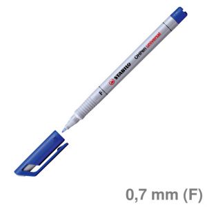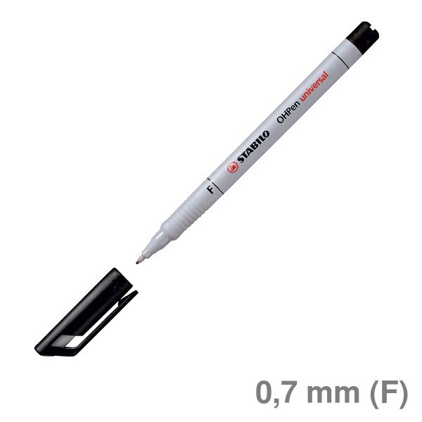 Feinschreiber Folienstift OHPen universal. Typbezeichnung der Mine: Kapillarspeicher. Ausführung Spitze: Schreibdocht, Fein (F) 0,7 mm, geeignet für Schablone. Art der Schreibflüssigkeit: geruchsarm, auf Alkoholbasis, schwarz. Schreibt auf fast allen glatten Oberflächen. Ausführung der Griffzone: rutschfest. Farbe der Kappe: schwarz. Material des Clips: Kunststoff. Farbe des Schaftes: hellgrau.