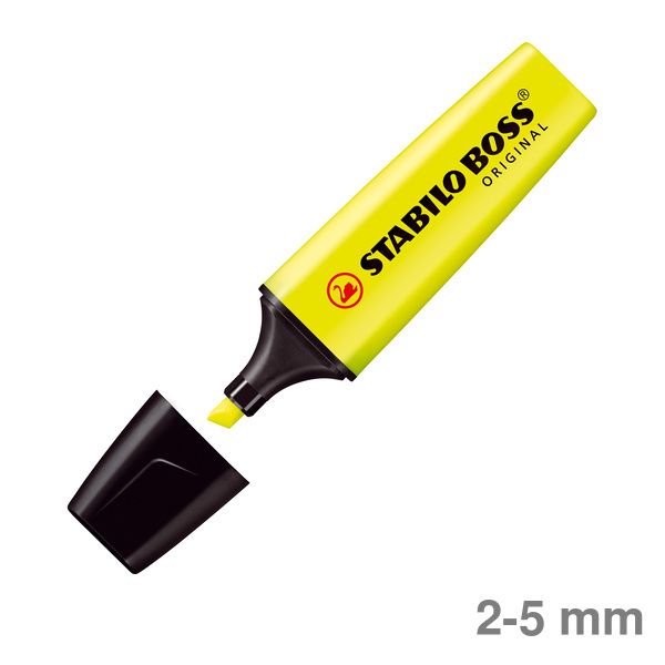 Textmarker BOSS® ORIGINAL. Nachfüllbar. Schattenfrei kopierbar. Strichstärke: 2 + 5 mm. Art der Schreibflüssigkeit: Tinte auf Wasserbasis, lichtbeständig gegeben. Tintenspeicher-Technik: Kapillarspeicher. Anti-Dry-Out Technology: 4 Stunden Austrockenschutz für konzentriertes Arbeiten. Unvergleichlicher Design-Klassiker - seit 1971. Farbe des Schaftes: in Schreibfarbe. Farbe: gelb.