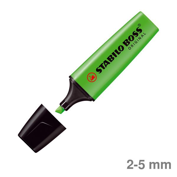 Textmarker BOSS® ORIGINAL. Nachfüllbar. Schattenfrei kopierbar. Strichstärke: 2 + 5 mm. Art der Schreibflüssigkeit: Tinte auf Wasserbasis, lichtbeständig gegeben. Tintenspeicher-Technik: Kapillarspeicher. Anti-Dry-Out Technology: 4 Stunden Austrockenschutz für konzentriertes Arbeiten. Unvergleichlicher Design-Klassiker - seit 1971. Farbe des Schaftes: in Schreibfarbe. Farbe: grün.