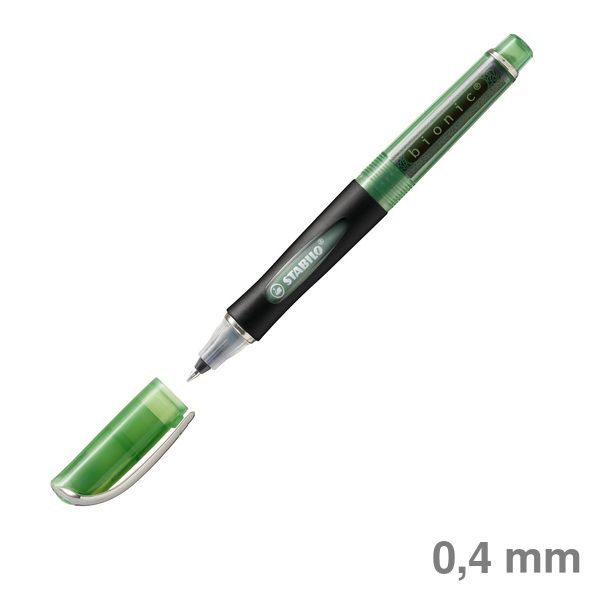 Tintenroller bionic®. Kappenmodell. Typbezeichnung der Mine: bionic® Refill. Art der Schreibflüssigkeit: Tinte auf Wasserbasis. Ausführung Mine: Tintenroller-Spitze für ein präzises Schriftbild - gleitet sanft über das Papier und kratzt nicht, 0,4 mm, grün, Mine auswechselbar. Kann einige Tage offen liegen bleiben, ohne einzutrocknen. Tintenspeicher-Technik: fortschrittliche Liquid-Ink-Technologie. Ausführung Stift: Schaft aus Polypropylen, mit weicher Griffzone für optimalen Halt. Material des Clips: Metall. Klares, zeitgemäßes Stift-Design. Kappe am Stiftende aufsteckbar. Farbe des Schaftes: schwarz/grün.