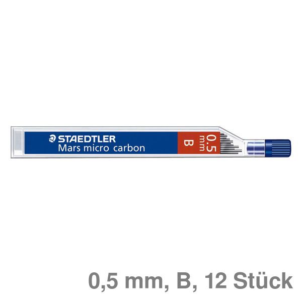 Feinmine Mars® micro carbon 250. Verwendung für Zeichnungsträger: Papier und Zeichenkarton. ISO-Kennzeichnung vorhanden. Efficient for ecology: über 90 % natürliche Rohstoffe, einzigartiges Herstellverfahren ohne PVC und Weichmacher, hohe Bruchfestigkeit durch elastische Mine. Stärke der Mine: 0,5 mm. Bezeichnung der Härte: B. Schreibfarbe der Mine: schwarz.