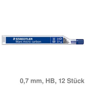Feinmine Mars® micro carbon 250. Verwendung für Zeichnungsträger: Papier und Zeichenkarton. ISO-Kennzeichnung vorhanden. Efficient for ecology: über 90 % natürliche Rohstoffe, einzigartiges Herstellverfahren ohne PVC und Weichmacher, hohe Bruchfestigkeit durch elastische Mine. Stärke der Mine: 0,5 mm. Bezeichnung der Härte: HB. Schreibfarbe der Mine: schwarz.