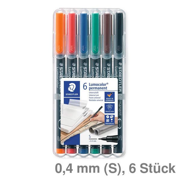 Feinschreiber Universalstift Lumocolor permanent. Nachfüllbar. Ausführung Spitze: S-Spitze, ca. 0.4 mm. Art der Schreibflüssigkeit: geruchsarme Tinte, xylol- und toluolfrei, 2 rot, 3 blau, 4 orange, 5 grün, 7 braun, 9 schwarz, wasserfest, lichtbeständig gegeben. Kann einige Tage offen liegen bleiben, ohne einzutrocknen. Efficient for ecology: Schaft und Kappe aus PP garantieren lange Lebensdauer, einfaches Nachfüllen mit Tankstelle 487 17. Farbe der Kappe: in Schreibfarbe. Material des Clips: Kunststoff. Farbe des Schaftes: schwarz.