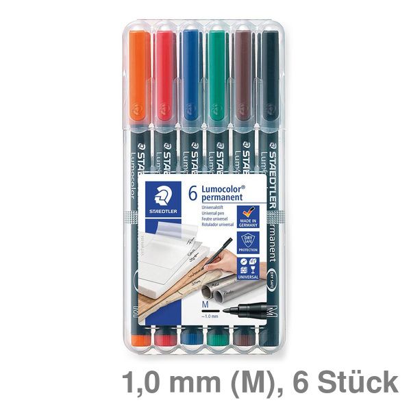 Feinschreiber Universalstift Lumocolor permanent. Nachfüllbar. Ausführung Spitze: M-Spitze, ca. 1.0 mm. Art der Schreibflüssigkeit: geruchsarme Tinte, xylol- und toluolfrei, 2 rot, 3 blau, 4 orange, 5 grün, 7 braun, 9 schwarz, wasserfest, lichtbeständig gegeben. Kann einige Tage offen liegen bleiben, ohne einzutrocknen. Efficient for ecology: Schaft und Kappe aus PP garantieren lange Lebensdauer, einfaches Nachfüllen mit Tankstelle 487 17. Farbe der Kappe: in Schreibfarbe. Material des Clips: Kunststoff. Farbe des Schaftes: schwarz.
