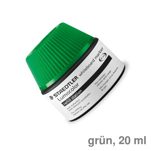 Tinte für Marker Lumocolor® refill station. Produktverwendung: Lumocolor® whiteboard marker 351. Art der Schreibflüssigkeit: Tinte, lichtbeständig gegeben. Efficient for ecology: Überfüllen ist unmöglich, da der Stift nur die maximal mögliche Tintenmenge aus der Tankstelle herauszieht, einfaches und sauberes Nachfüllen. Ausführung des Behälters: PP-Tank. Inhalt: 30 ml. Farbe: grün